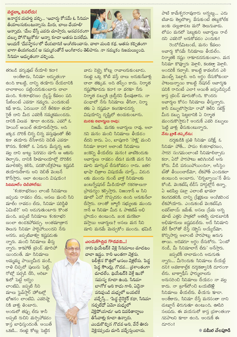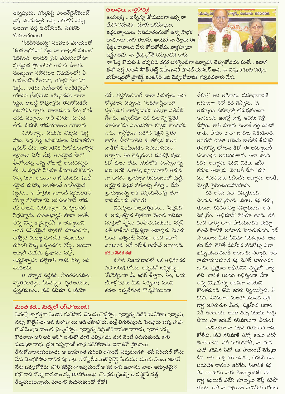 * మీరు తీసిన చిత్రాల్లో ‘శంకరాభరణం’ శిఖరాగ్ర సమానం. ఆ సినిమా తరవాత.. మీ నుంచి ఓ సినిమా వస్తోందంటే ప్రేక్షకులు, విమర్శకులు ఓ ప్రత్యేకమైన అంచనాలతో సిద్ధమయ్యేవారు. ఆ ఒత్తిడిని మీరెలా తట్టుకునేవారు?