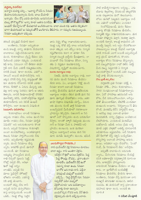 ఎదుటివాళ్లకు సలహా ఇచ్చే స్థాయిలో నేను లేను. ఇచ్చినా వినడం లేదు. నా మాట మనవలు, మనవరాళ్లే వినడం లేదు. ఇక బయటివాళ్లు ఎందుకు వింటారు? అలాంటప్పుడు చెప్పడంలో అర్థం ఏముంటుంది? 30 ఏళ్లొచ్చినవాడ్ని పెళ్లి చేసుకోమంటే ‘ఇప్పుడే ఎందుకు?’ అని అడుగుతున్నాడు. వీళ్లకు మనం ఏం చెబుతాం. ఎవరి నిర్ణయాలు వాళ్లే తీసుకుంటున్నారు. ఇది వరకు మన పెద్దలు ఏం చెప్పేవారు కాదు.. అయినా చెప్పినంత ఎఫెక్ట్ ఉండేది. మా నాన్న, మా అమ్మ నాకు ప్రత్యేకంగా ఓ పాఠంలా, వాక్యంలా నీతి బోధ చేయలేదు. వాళ్ల జీవితాలు, నడవడిక చూసి మేం నేర్చుకున్నాం. అందుకే మేం బాగున్నాం. ఈనాటి యువ దర్శకులకు ‘రక్తపాతం వద్దు’ అంటే వింటారా? అదే ఓ వ్యాపార సూత్రమైపోయింది. ఆ పాయింట్తోనే సినిమాలు తీసి హిట్లు కొడుతున్నారు. ఇక వాళ్లకేం చెబుతాం? అయినా నా దగ్గర చెప్పడానికి స్టాకు ఏం లేదు. |