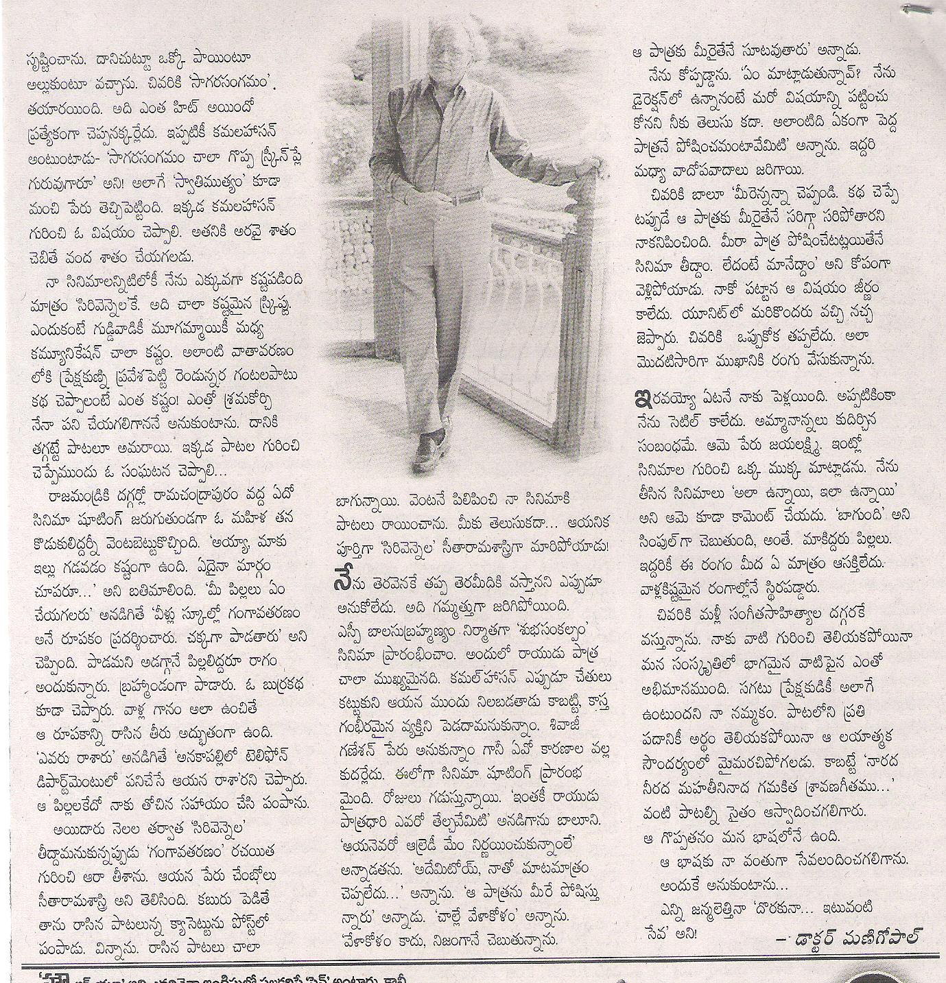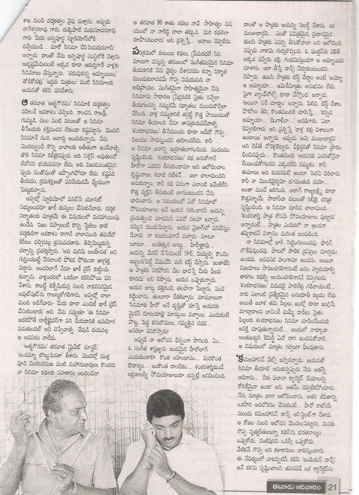 సంగీతం, నాట్యం.. ఈ రెండు విషయాల్లో మాత్రం వేలు పెట్టేవాడ్ని. అలాగని నాకు సంగీతం తెలీదు. సంగీత దర్శకుల నుంచి నాకు కావల్సిన రీతిలో, నా పద్ధతిలో సంగీతం రాబట్టుకోవాలి అనే తపన మాత్రమే ఉండేది. సంగీతం రాబట్టుకోవడానికి ఓ థియరీ, ప్లాన్ అంటూ నా దగ్గర ఉండేవి కావు. ‘నువ్వేం కావాలనుకుంటున్నావో చెప్పు’ అని ఎవరైనా అడిగితే నేనేం చెప్పను? ‘ఇంకా బాగుంటే బాగుంటుంది’ అని చెబితే వేళాకోళం అనిపిస్తుంది. కేవీ మహదేవన్, ఇళయరాజా లాంటి మహానుభావుల దగ్గర ఇలాంటి మాటలు మాట్లాడితే అవన్నీ వెర్రి కూతలు అవుతాయి. నృత్యం కూడా అంతే. నాకు తెలిసినంత వరకూ జోక్యం చేసుకునేవాడ్ని. వాళ్లు చాలా సహృదయంతో వినేవాళ్లు. అందుకే మంచి ఫలితం వచ్చింది.