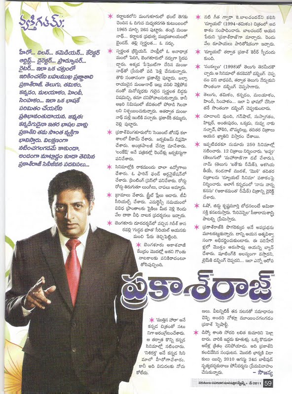 ప్రకాశ్రాజ్: పుట్టి పెరిగిందంతా బెంగుళూరులోనే. నాన్నది మంగళూరు. అమ్మది హుబ్లీ దార్వాడ్.ఒక అనాథాశ్రమంలో పెరిగి బెంగుళూరులోని ఓ ఆసుపత్రిలో నర్సుగా చేరింది. మా నాన్న జబ్బుచేసి అదే ఆసుపత్రిలో చేరారు. అక్కడే అమ్మతో ప్రేమలో పడ్డారు.