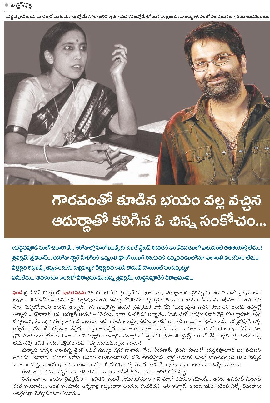I used to be in the same place (I interviewed Trivikram at the place which he continue to use as office and hangout place from the time he entered Hyderabad to become a film director) and used to hangout at an Irani Chai cafe called ‘Try Luck’, which used to be there opposite to ETV office in Somajiguda. I used to meet Venu (actor) and Shyam (producer) at that cafe. I narrated the story of Swayamvaram to them. They believed in the story value. I have told the dialogue ‘Prema ane swargam nundi 7 adugula dooramlo vunde narakame pelli’ as the gist to the story. After listening to this, Vijay Bhaskar insisted that I should pen dialogues for this movie. Shyam took many risks and crossed several obstacles to produce and release the movie. It became a hit.