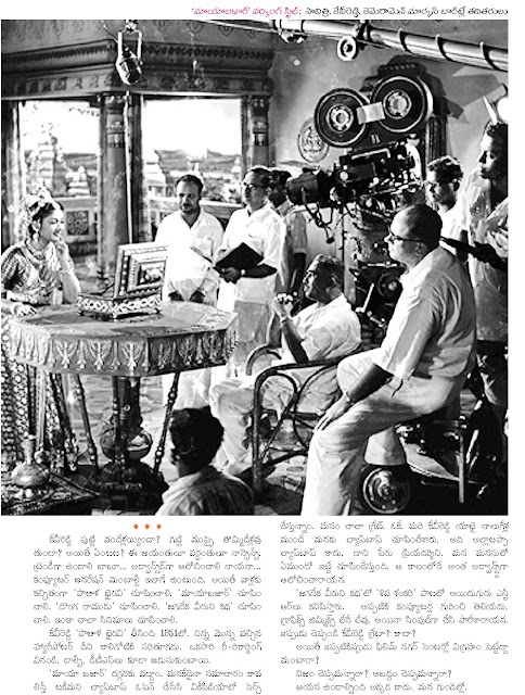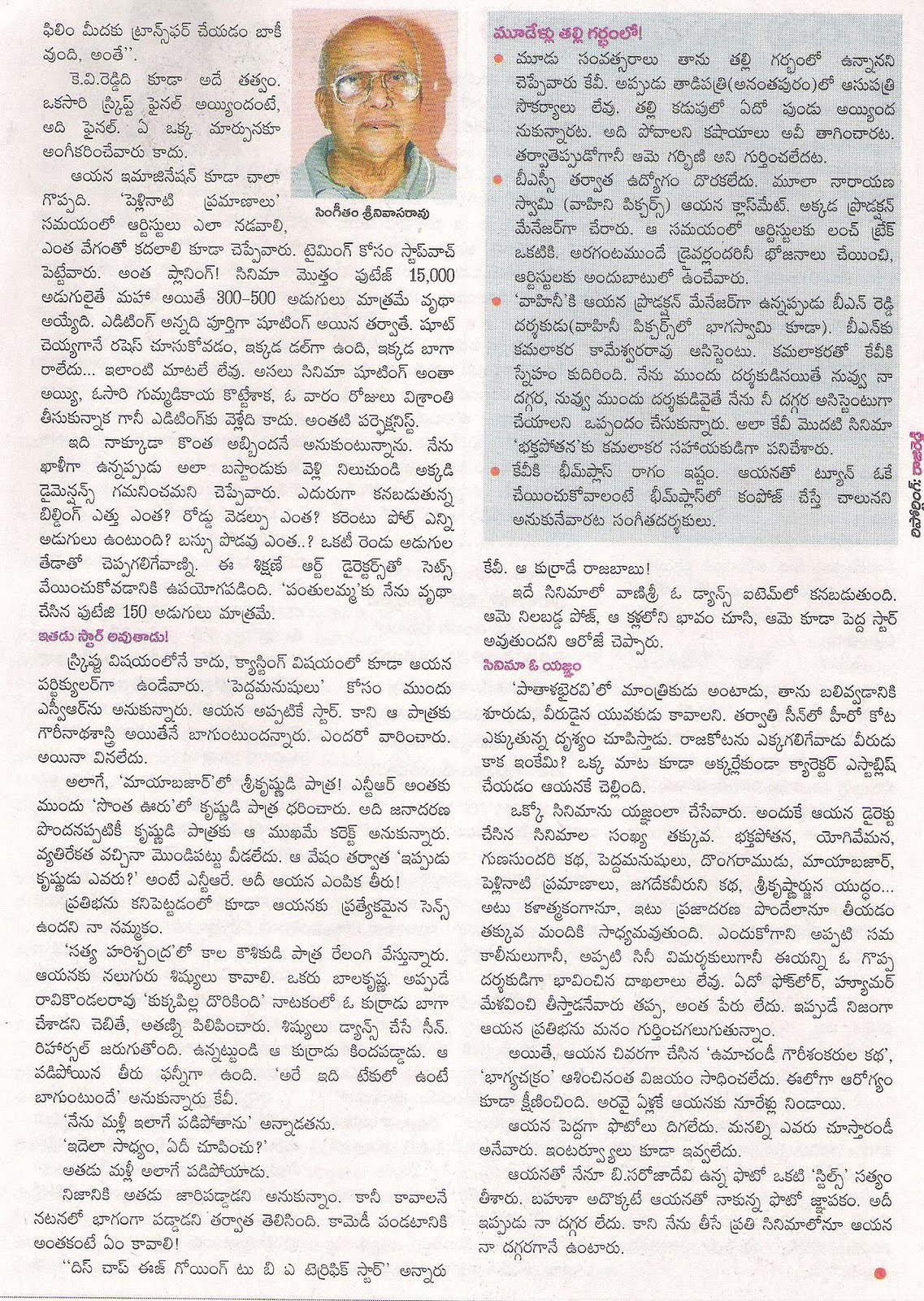 షూటింగ్ సమయంలో కెవి అనుసరించిన విధానమే వేరు. ఆర్టిస్టులకు నటించి చూపడం, ఇలా చెయ్యండి అని చెప్పడం ఆయనకు అలవాటు లేదు. ఆర్టిస్టుల్నే నటించమనే వారు. అది తనకి కావాల్సిన రీతిలో లేకపోతే ఇంకోలా చెయ్యమని చెప్పి, తనకి నచ్చిన షాట్‌ని ఫైనలైజ్ చేసేవారు. మరో విషయం ఏమిటంటే షాట్‌లో ఆరుగురు ఆర్టిస్టులుంటే , డైలాగ్ చెప్పే ఆర్టిస్ట్ ఒకరే అయినా ఆరు ఫైనల్ రిహార్సల్స్ చేయించేవారు. ప్రతి రిహార్సల్‌లో ఆర్టిస్టుల రియాక్షన్ గమనించేవారు.