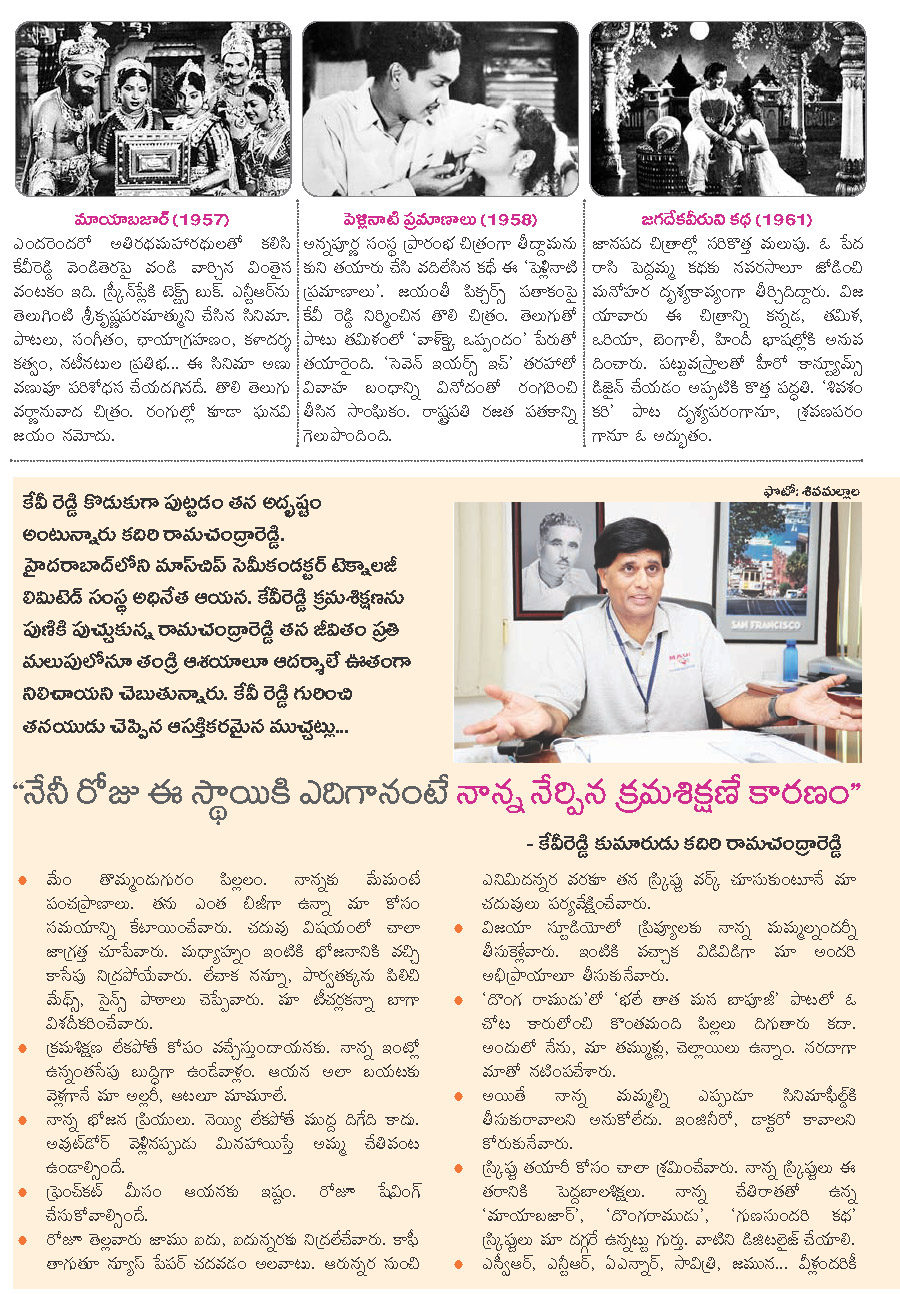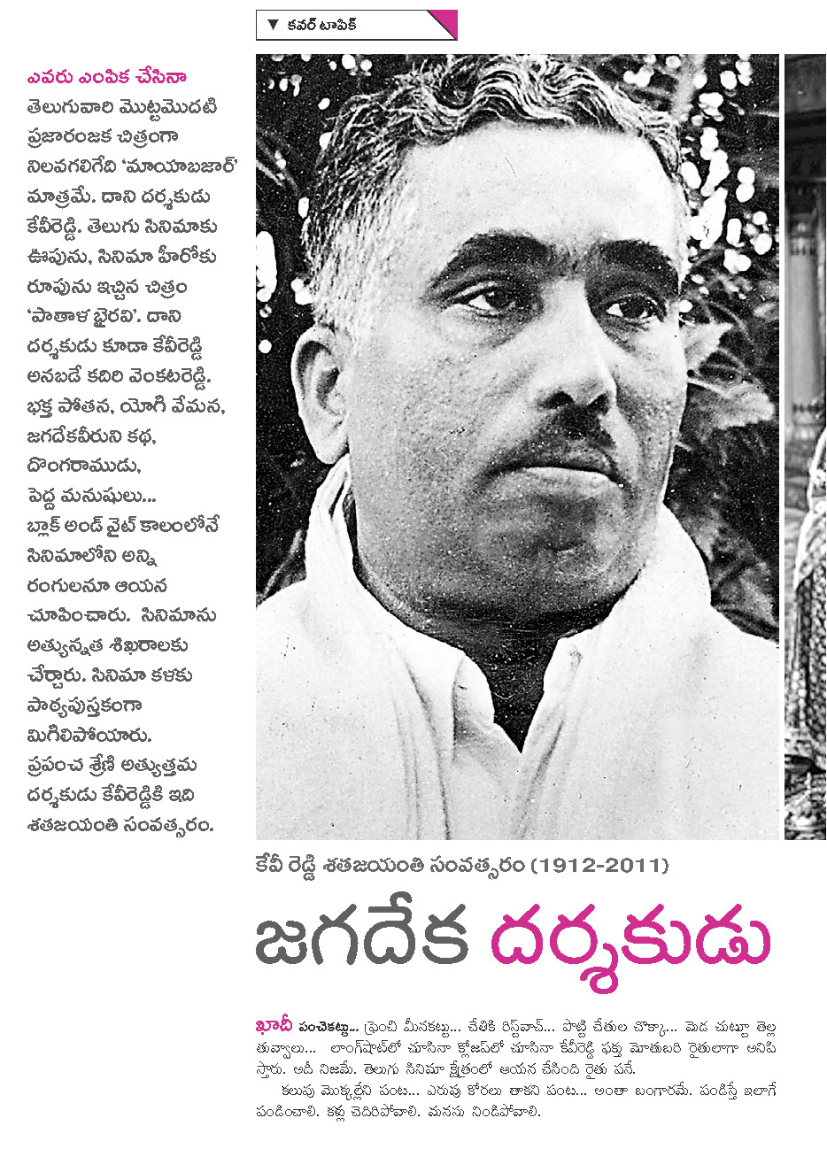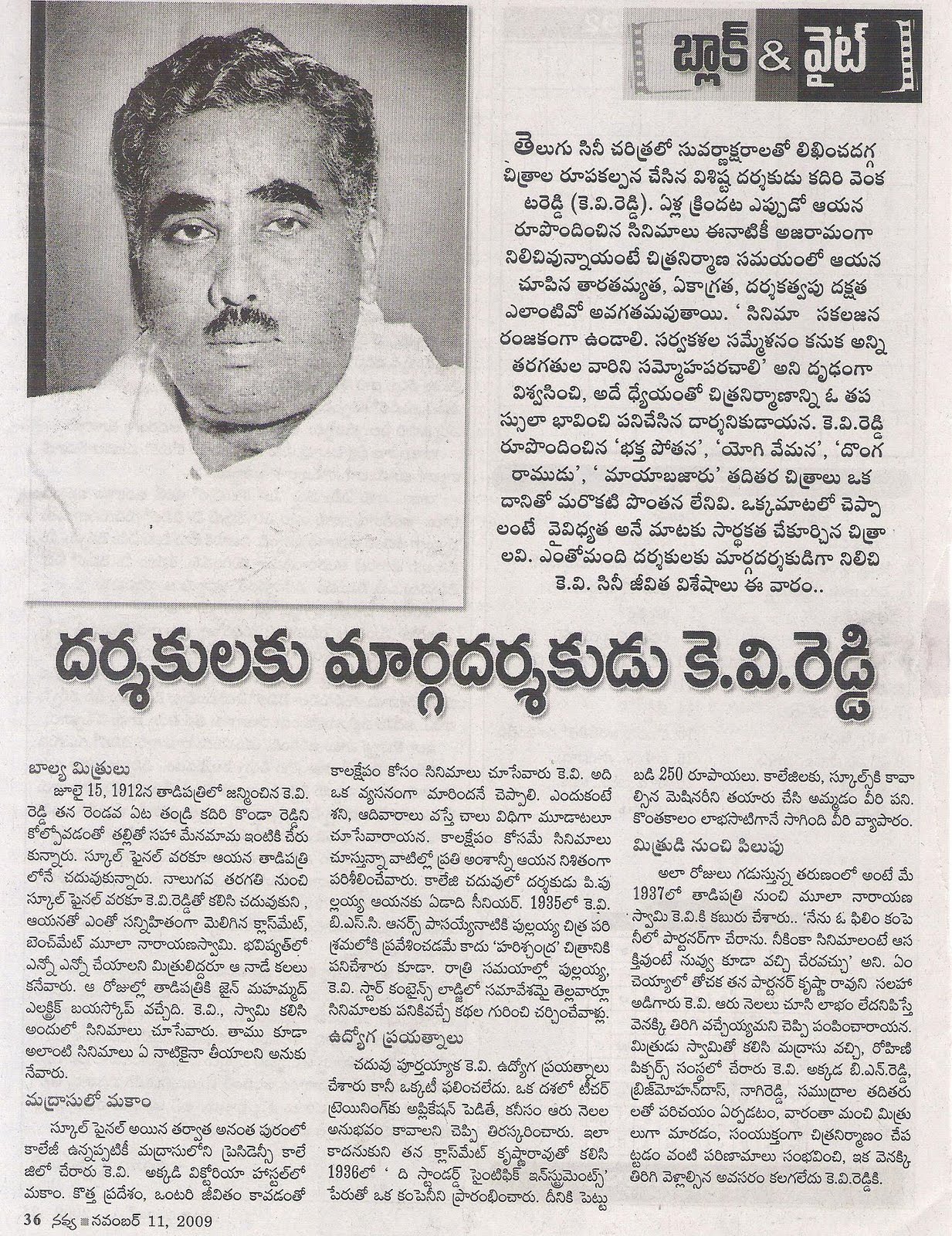 తెలుగువారు గర్వంగా తలెత్తుకునే రీతిలో చిత్రాలను రూపొందించిన దర్శకుడు కె.వి.రెడ్డి. ఆయన పూర్తి పేరు కదిరి వెంకటరెడ్డి. తక్కువ సినిమాలే చేసినా ఒక్కో సినిమా ఒక పాఠ్యగ్రంధంలా మిగిలింది. ఆయన పౌరాణికాలు తీశారు, జానపదాలు రూపొందించారు. భక్తి రస చిత్రాలు, సాంఘికాలు తీశారు. ఏ సినిమా తీసినా అందులో ఆయన ముద్ర స్పష్టంగా కనిపించేది. ఎందరికో మార్గదర్శకంగా నిలిచిన కె.వి.రెడ్డి శత జయంతి (జూలై 1) సందర్భంగా ఈ ప్రత్యేక వ్యాసం.