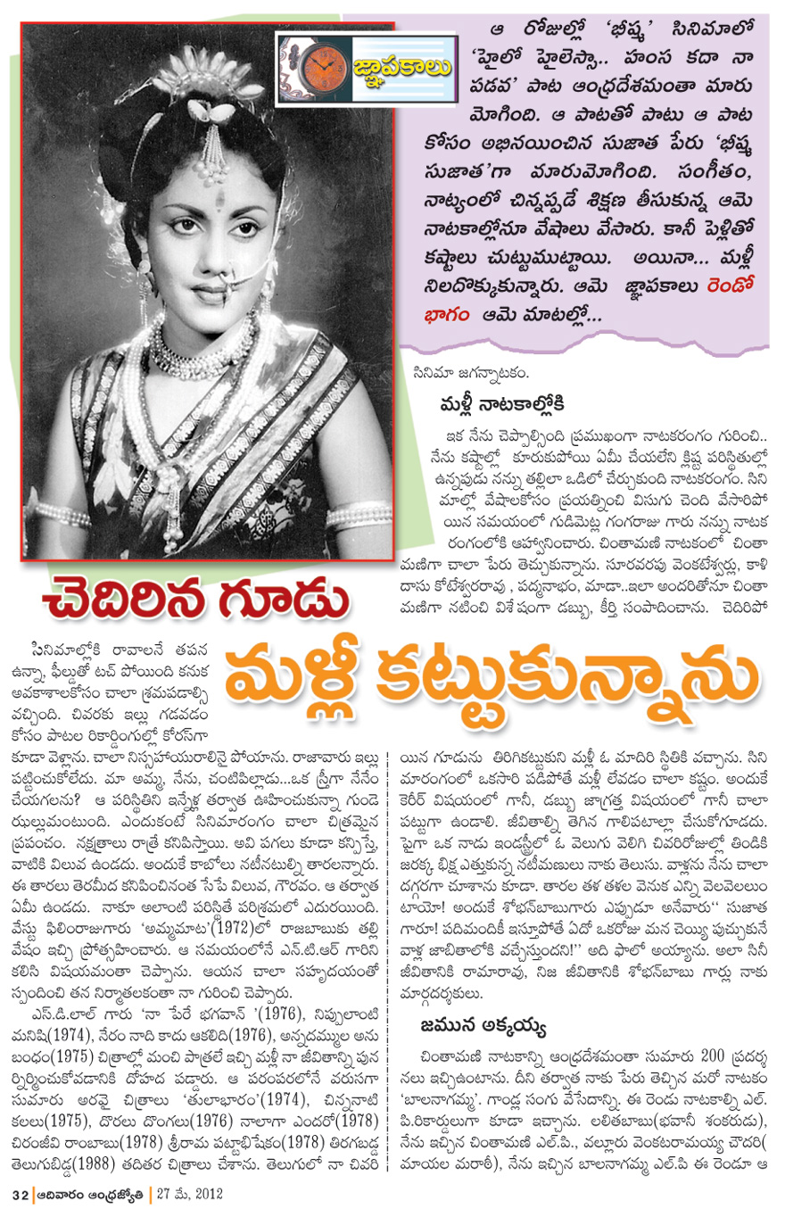 ‘హైలో హైలెస్సా..’ అంటూ శంతనుని మనసే గాక ఆంధ్ర ప్రేక్షక లోకాన్నంతా జమునారాణి కంఠం సహాయంతో ఉర్రూతలూగించిన సినీ మత్స్యగంధి సుజాత. సినిమా, నాటకం, గాత్రధారణ…ఈ మూడురంగాల్లోనూ విశేష ప్రతిభ కనబరిచి ప్రేక్షకహృదయాల్లో ఇప్పటికీ ‘భీష్మ’ సుజాతగా నిలిచిపోయిన నిన్నటితరం సుజాత జ్ఞాపకాలే ఈ వారం.