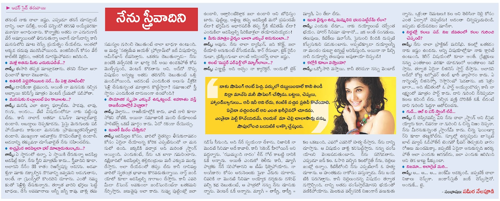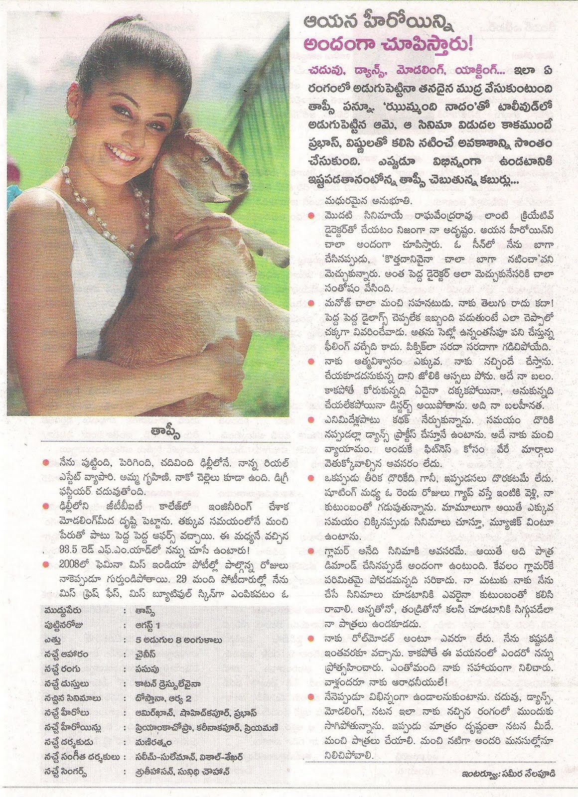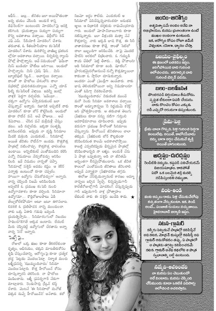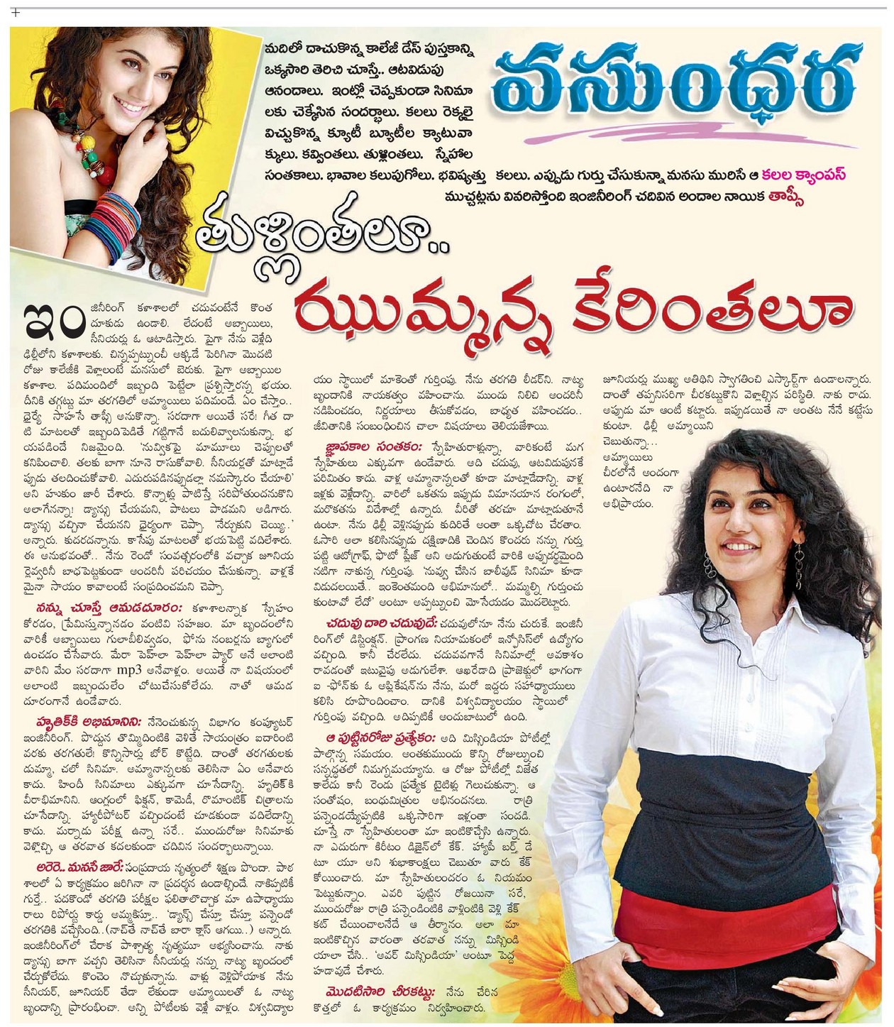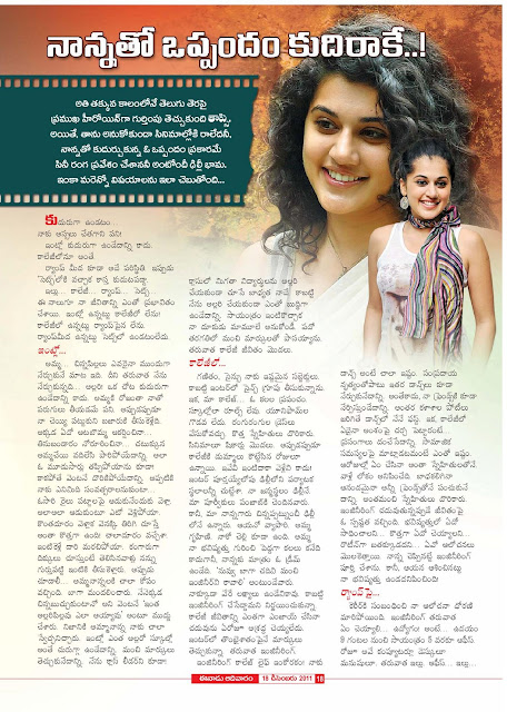 ‘ఝుమ్మంది నాదం’తో వెండితెరకు పరిచయమైన దిల్లీ అమ్మాయి తాప్సీ పన్ను. తర్వాత ఇటు దక్షిణాదిలో, అటు బాలీవుడ్‌లో బిజీ నటి అయిపోయింది.  తన దశాబ్దకాల సినిమా అనుభవాలనీ, వ్యక్తిగత ఇష్టాలనీ, భవిష్యత్తు లక్ష్యాలనీ చెబుతోందిలా!