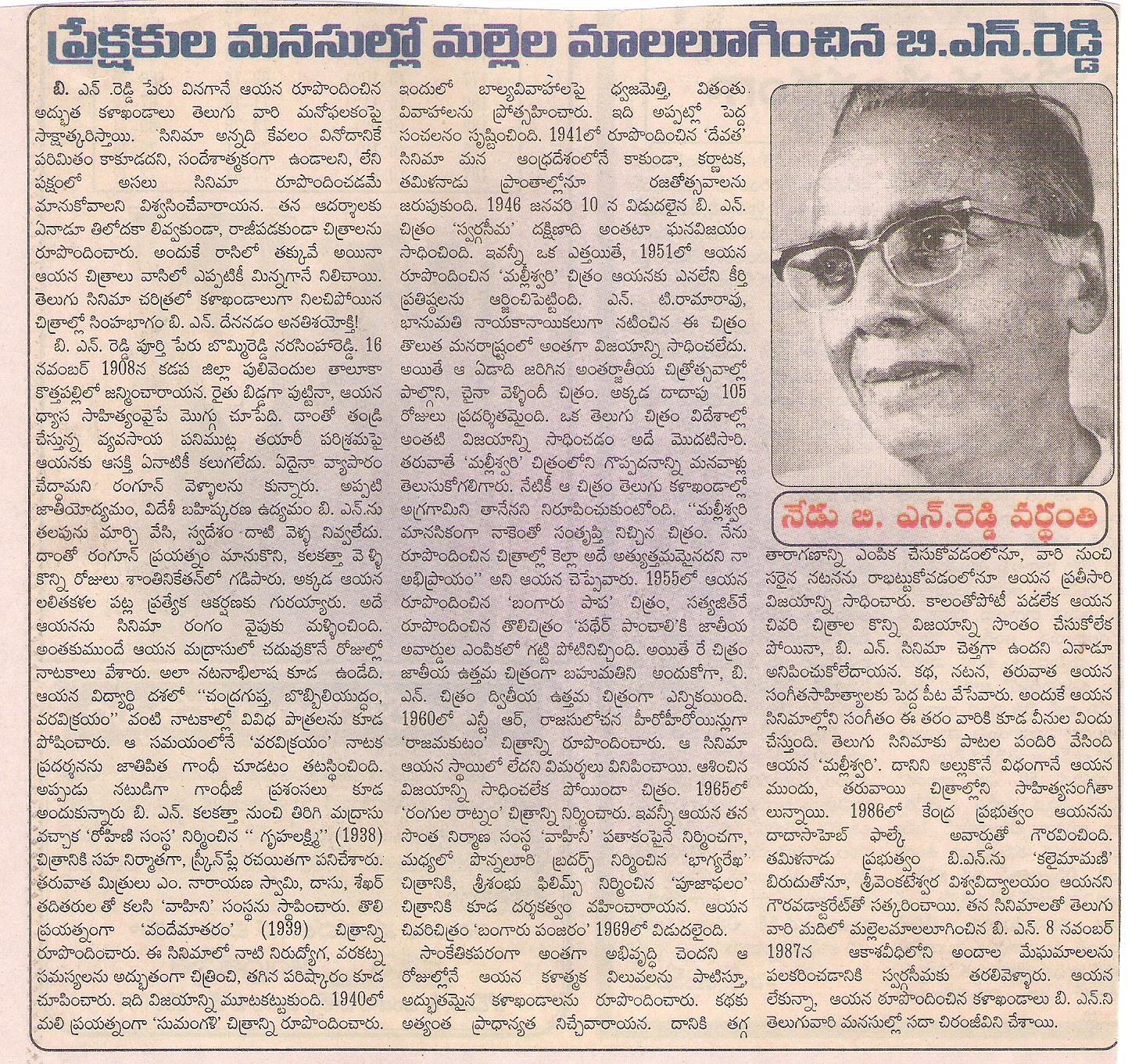 ప్రేక్షకుల మనసుల్లో మల్లెల మాలలూగించిన బి.ఎన్.రెడ్డి